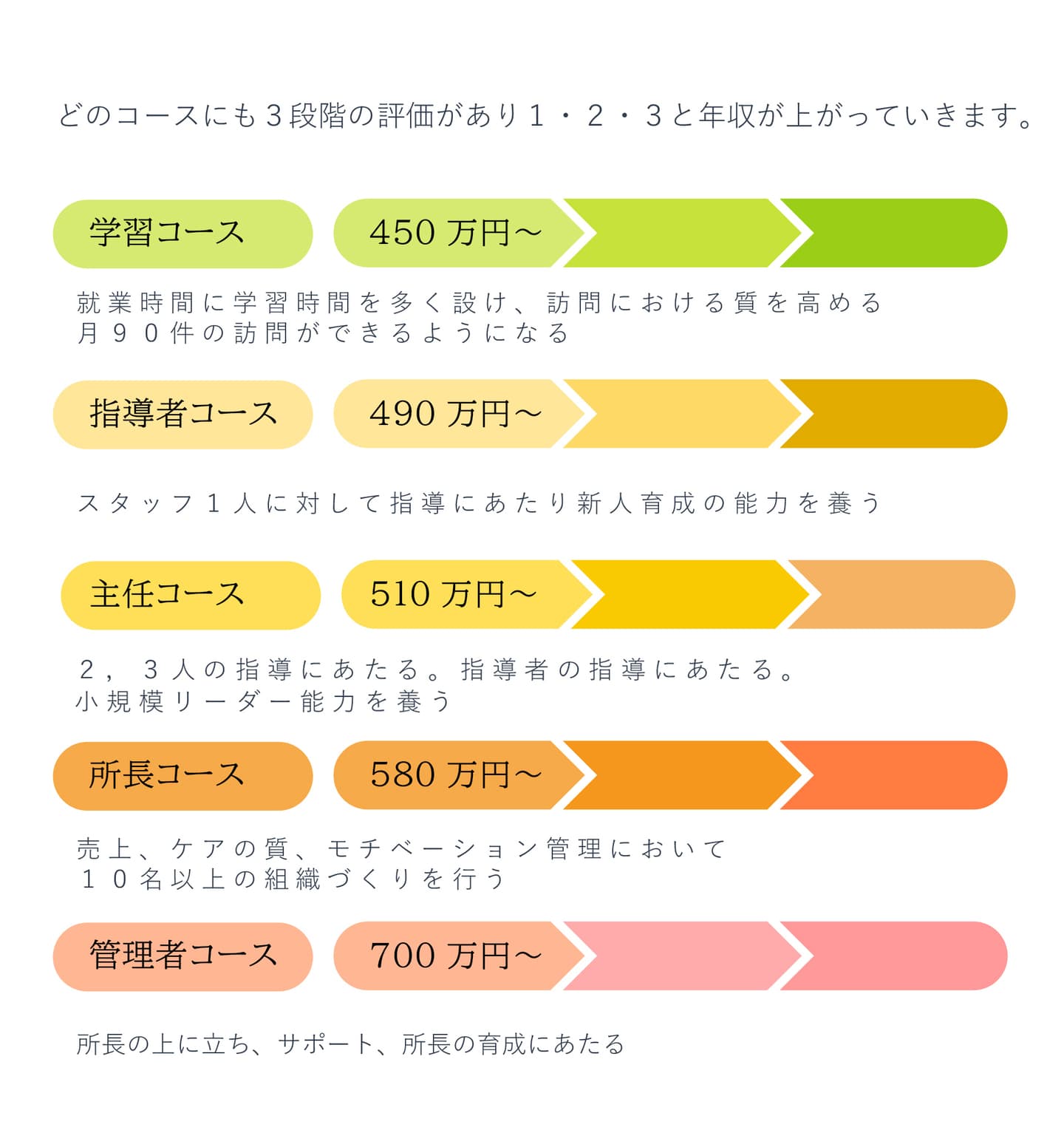 役職に就くのではなく、たくさんの訪問件数を訪問したいスタッフには指導者コース後インセンティブコースへと進んでいただきます。
